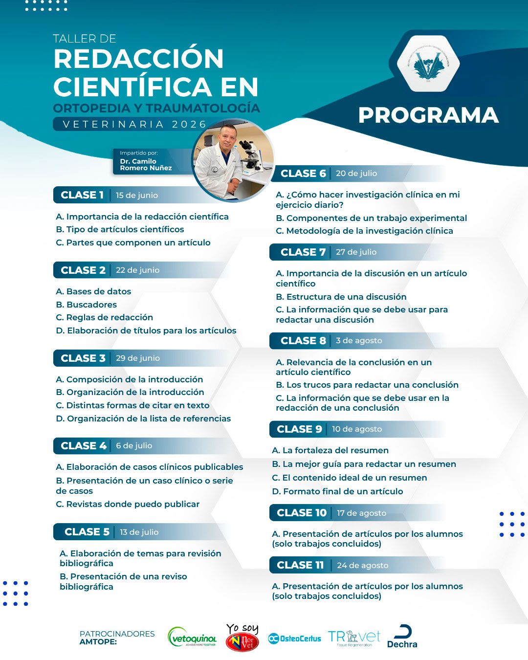 Este taller está diseñado para médicos veterinarios interesados en fortalecer sus habilidades en la redacción científica aplicada a la práctica clínica. A lo largo de 11 sesiones, se abordarán temas clave como la estructura de artículos científicos, búsqueda de información, elaboración de introducciones, discusión y conclusiones, así como la presentación de casos clínicos publicables.